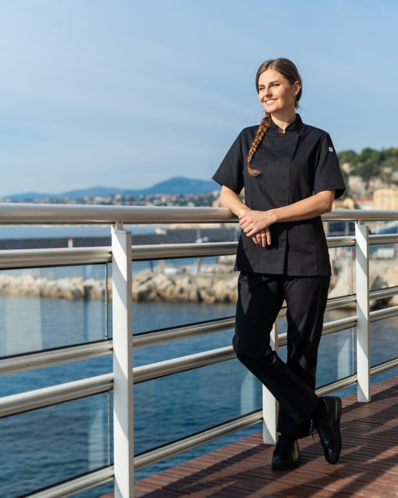 Confectionnée dans un tissu français respirant et résistant, elle offre une liberté de mouvement optimale et une coupe ajustée. Les finitions contrastées, les boutons pressions discrets et la possibilité de personnaliser chaque modèle (broderie) en font un vêtement unique, à l’image de chaque chef.